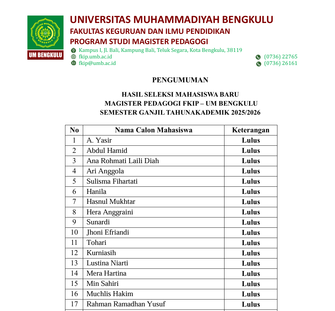 Bengkulu, 31 Agustus 2025 – Program Studi Magister Pedagogik Universitas Muhammadiyah Bengkulu menyelenggarakan kegiatan Seminar Judul Tesis yang diikuti oleh para mahasiswa tingkat akhir pada hari Minggu, 31 Agustus 2025.…